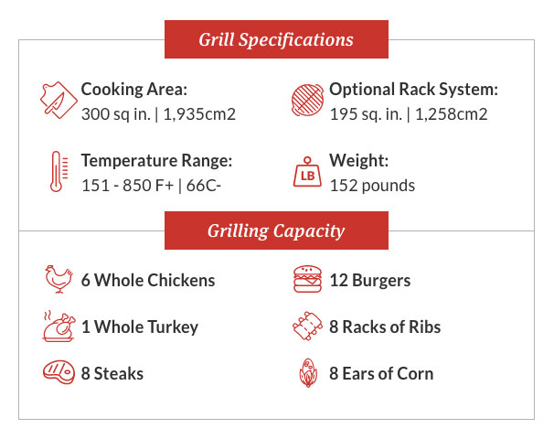 Perfecta para cocinar cantidades «grandes» de comida. Grill, hornear, asar o ahumar cualquier alimento y aumentar su área de cocina con el extensor de rejilla opcional. Barbacoa mostrada con carro Primo Grill y tapa de una sola pieza.